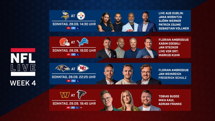 Aktuelle Spieltagstrailer: Ab sofort stehen die NFL Spieltagstrailer im Media Hub von RTL Deutschland für registrierte User zum Download bereit. Alle Hinweise zur Verwendung finden Sie hier.
