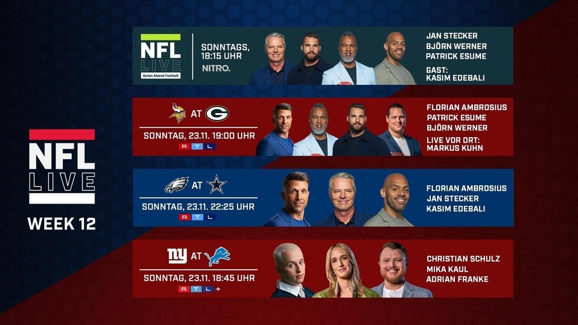 Die Rivalen-Gipfel im Free-TV! In Woche zwölf der NFL Regular Season stehen die traditionsreichsten Rivalitäten der US-Liga bei RTL im Mittelpunkt. Unmittelbar nach dem Kickoff-Talk „Guten Abend Football“ um 18:15 Uhr bei NITRO, mit allen Hintergründen zu den Matchups des Spieltags, folgt um 19:00 DER NFC-North-Kracher: RTL präsentiert das ewige Duell zwischen den Minnesota Vikings und den Green Bay Packers im legendären Lambeau Field! Seit Jahrzehnten liefern sich beide Franchises erbitterte Duelle um die Divisionskrone. Ab 22:25 Uhr folgt mit den Philadelphia Eagles bei den Dallas Cowboys ein nicht minder brisantes Hassduell. Das Aufeinandertreffen beider Rivalen gilt als der Dauerbrenner in der US-Primetime. Ein weiteres Highlight wartet ab 19:00 Uhr auf RTL+: Die Detroit Lions um den deutsch-amerikanischen Wide Receiver Amon-Ra St. Brown wollen ihre Titelambitionen gegen die New York Giants untermauern.