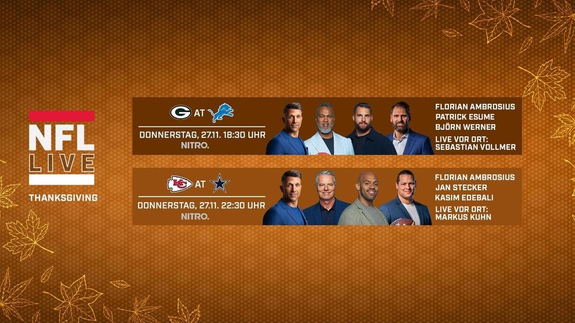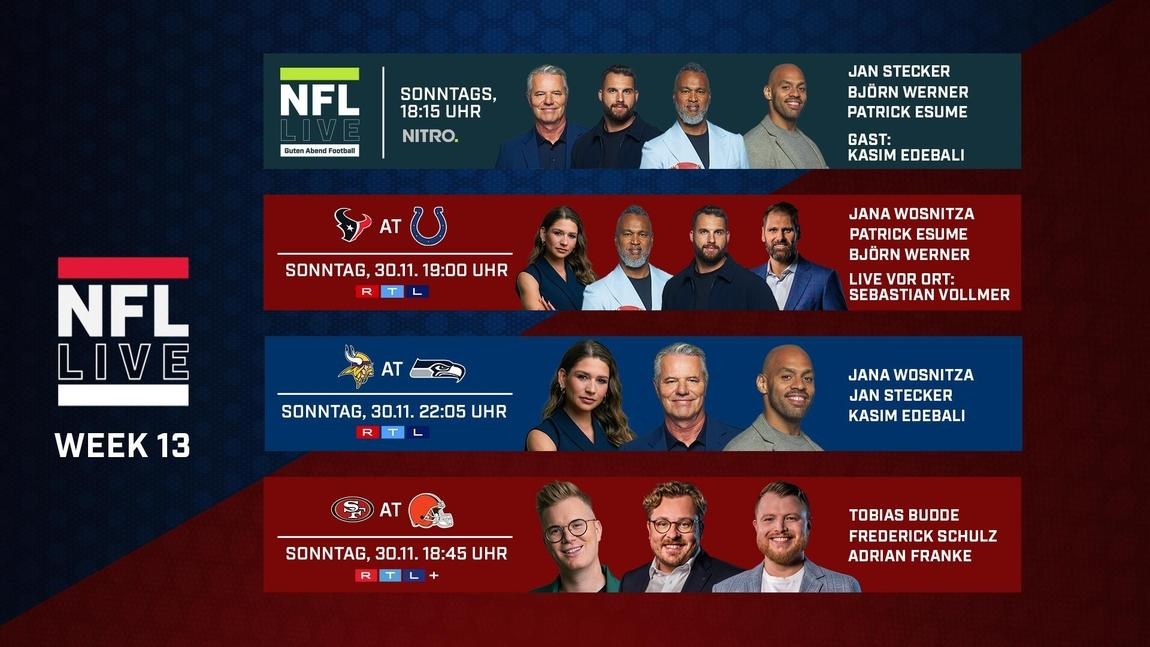 Einen weiteren Erfolg landete RTL am Sonntagabend mit der NFL Regular Season: Die Partie zwischen den Philadelphia Eagles und den Dallas Cowboys zur Kickoff-Zeit um 22:25 Uhr erzielte sehr gute 8,3 Prozent bei den 14- bis 59-Jährigen und 11,1 Prozent Marktanteil bei den 14- bis 49-Jährigen. In der Zielgruppe der jungen Männer (14–29 Jahre) punktete insbesondere die frühe Partie um 19:00 Uhr mit hervorragenden 20,6 Prozent.