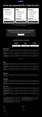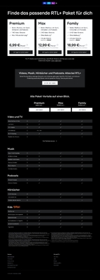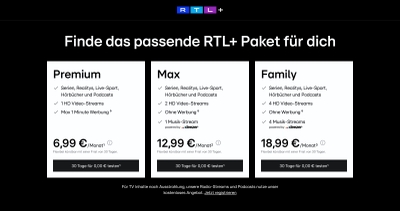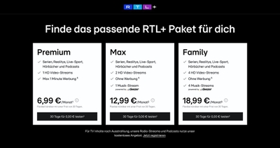 Die Tarifstruktur von RTL+ ändert sich nicht. So hält der Streamingdienst für alle Bedürfnisse ein Abo-Angebot bereit. Neben dem Free-Bereich wird es weiterhin das Premium-Abo für 6,99 Euro geben. Auf das komplette All Inclusive Entertainment Angebot können die Streamer:innen mit dem Max-Abo für 12,99 Euro und dem Family-Abo für 18,99 Euro zugreifen.