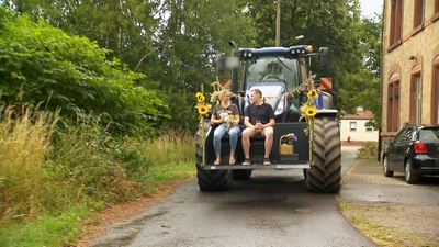 Max (26) hat sich nach dem ersten Kennenlernen für Anna (angehende Erzieherin) entschieden. Mit einem Blumenstrauß und einem liebevoll geschmückten Trecker holt der Jungbauer die 25-Jährige ab.
