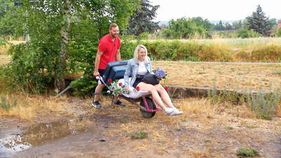 Sehr viel kleiner und auf zwei Rädern macht sich Erik (31) auf den Weg, um seine Julia (23, Bürokauffrau) vom Bahnhof abzuholen. Der Hobbybauer fährt seine Hofdame mit einer Schubkarre zu sich nach Hause.