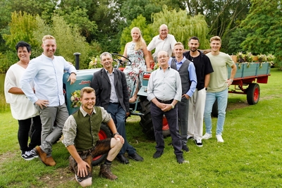 Zehn der insgesamt 13 Bäuerinnen und Bauern der aktuellen Staffel beim Scheunenfest. V.l.: Simone, Daniel, Michi, Johann, Insa, Herbert (hinten), Walter, Christopher, Basti, Friedrich. +++ Die Verwendung des sendungsbezogenen Materials ist nur mit dem Hinweis und Verlinkung auf RTL+ gestattet. +++
