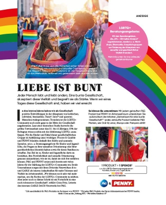 Egal ob im TV, Digital, Print oder über Social Media. Procter & Gamble greift auf das umfassende Portfolio der Ad Alliance zurück und thematisiert übergreifend die Vielfalt der Gesellschaft und das gemeinsame Einstehen für ein bunteres Miteinander. Gleichzeitig wird in allen Ad Specials auf die Spendenaktion aufmerksam gemacht. TV Ad Specials bei RTL und VOX (u.a. im Umfeld des Primetime Formats „Viva la Diva“ und „First Dates“), werden durch native Kampagnenbausteine in Digital und Print ergänzt. So bildet ein Multiple Content Special auf RTL News, STERN und BRIGITTE den digitalen Home of Content, der redaktionelle Beiträge mit zwei Kundenartikeln unter dem Themendach LGBTIQ+ bündelt. Begleitet wird dieser durch passende Print Advertorials im STERN oder der aktuellen Ausgabe der BRIGITTE sowie einer nativen Social Media Einbindung auf den Instagram Accounts der selbigen Medienmarken (@stern, @rtl_com, @brigittemagazin).