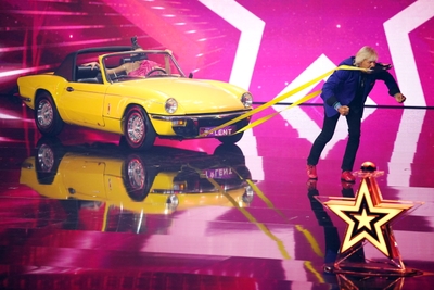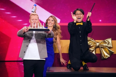 Dan Meyer zieht ein Auto mit Jurymitglied Ekaterina Leonova. +++ Die Verwendung des sendungsbezogenen Materials ist nur mit dem Hinweis und Verlinkung auf RTL+ gestattet. +++