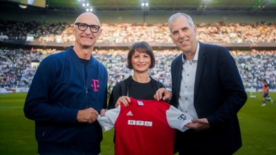 V.l.: Vorstandsvorsitzender der Deutschen Telekom AG Timotheus Höttges, Adidas-Geschäftsführerin Marina Mogus und CEO RTL Deutschland Stephan Schmitter +++ Die Verwendung des sendungsbezogenen Materials ist nur mit dem Hinweis und Verlinkung auf RTL+ gestattet. +++