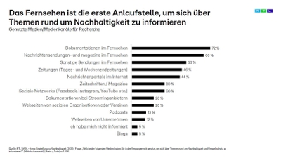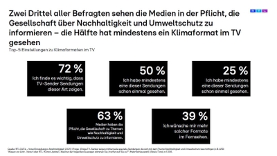 Das Fernsehen ist mit Abstand die erste Wahl, um sich über Nachhaltigkeit und Klimaschutz zu informieren. Egal ob Dokumentationen (72 Prozent) oder Nachrichtensendungen- und Magazine (66 Prozent) – alles wird genutzt. Rund drei Viertel der Befragten (72 Prozent) finden es wichtig, dass diese Art von Inhalten im TV gezeigt werden, 63 Prozent sehen Medien sogar in der Pflicht, die Gesellschaft über Themen wie Nachhaltigkeit und Umweltschutz zu informieren. Vorhandene Klimaformate im TV wurden bereits von der Hälfte der Befragten mindestens einmal gesehen. 39 Prozent wünschen sich sogar mehr „nachhaltige“ Inhalte im Fernsehen.