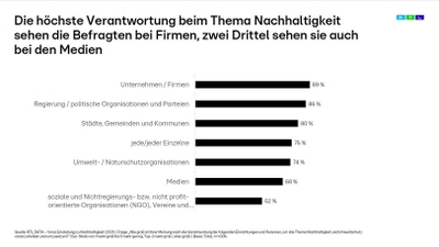 Für 81 Prozent der Befragten sind die Themen Nachhaltigkeit und Klimawandel wichtig bzw. sehr wichtig und 79 Prozent sind zudem der Meinung, dass das Thema in den nächsten Jahren noch weiter an Bedeutung gewinnen wird. Die Eigenverantwortung ist den Befragten bewusst (77 Prozent), noch stärker sehen sie aber andere Akteure in der Verantwortung. Die größte Verantwortung wird bei Unternehmen (89 Prozent) und Politik (86 Prozent) gesehen – zwei Drittel sehen diese aber auch bei den Medien (68 Prozent).