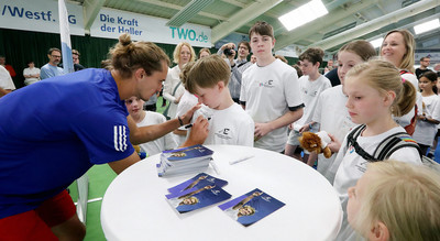 "Aufschlag gegen Diabetes" - Alexander Zverev begeistert bei Kids-Training seiner Stiftung. Gruppenbild mit Olympiasieger: 40 Kids aus allen Teilen Deutschlands waren mit ihren Eltern nach Halle angereist ? zur Veranstaltung der Alexander Zverev Foundation +++ Die Verwendung des sendungsbezogenen Materials ist nur mit dem Hinweis und Verlinkung auf RTL+ gestattet. +++