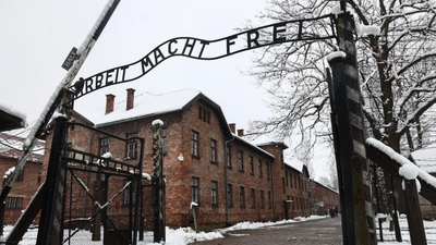 Das Eingangstor mit der Aufschrift "Arbeit macht frei" im ehemaligen nationalsozialistischen deutschen Konzentrationslager Auschwitz I an der Gedenkstätte Auschwitz während des Internationalen Holocaust-Gedenktages und des 77. Jahrestages der Befreiung von Auschwitz - Birkenau. +++ Die Verwendung des sendungsbezogenen Materials ist nur mit dem Hinweis und Verlinkung auf RTL+ gestattet. +++