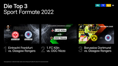 • Begeisternder Live-Sport: Das Fußball-„Europa-League“ Finale Eintracht Frankfurt gegen Glasgow Rangers am 18. Mai bescherte RTL mit 27,8 Prozent den besten Tagesmarktanteil seit dem 18. Juni 2006 in der Zielgruppe der 14- bis 49-Jährigen. Das Spiel war zudem mit insgesamt 9,05 Millionen Zuschauer:innen die erfolgreichste TV-Sendung des Jahres. Der Marktanteil bei den 14- bis 49-Jährigen lag bei herausragenden 50,3 Prozent.