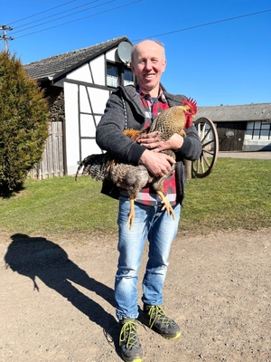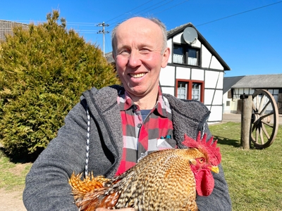 Theo lebt mit seiner Mutter auf einem Vierseitenhof in der Eifel. Der 58-Jährige kümmert sich im Haupterwerb um 155 Rinder und Hahn Poppie. Auch 130ha Grün- und Ackerland nennt er sein Eigen. „Ich bin hier geboren und aufgewachsen. Mir gefällt einfach die Freiheit, die Unabhängigkeit, dass ich am Ende des Monats sehen kann, was ich geschafft habe. Da bin ich sehr stolz drauf.“