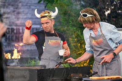 Beim Impro-Gang verteilt Lorenz Büffel noch Bier ans Publikum, aber bei seiner Vorspeise „Gefüllte Calamari mit gegrilltem Salat“ wird es für den Party-Profi ernst. Koch-Coach Ali Güngörmüş feuert unermüdlich seine Kommandos rein – manchmal auch dreimal, bis sie beim Büffel ankommen. Doch während die Calamari auf dem Grill brutzeln, lässt sich Lorenz Büffel eines nicht nehmen: Party machen! Mit spontanen Gesängen und Ballermann-Charme bringt er die Küche zum Beben – und das Publikum feiert lautstark mit. Nur Kochen UND Quatschen gleichzeitig bleibt für Lorenz Büffel eine echte Herausforderung. Als Laura Wontorra wissen will, wie er privat mal zur Ruhe kommt, überrascht der Stimmungsgarant plötzlich mit leisen Tönen: „Bei meiner Familie, meiner Frau Emily und meinen Söhnen Leo und Bruno.“