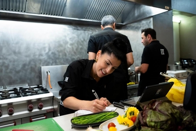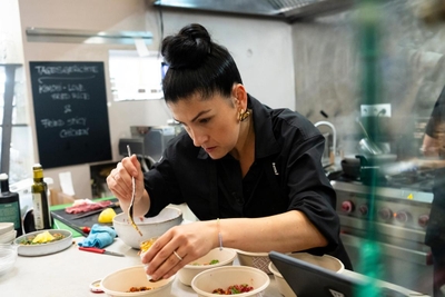 Kaum haben Ali und Elif das Mise-en-place für ihre Tagesgerichte vorbereitet, kommt eine vierköpfige Gruppe zu ihnen an den Tresen. Mitgebracht haben sie eine prallgefüllte Gemüsekiste, aus denen die beiden Köche nun die Gerichte für sie zubereiten sollen. Wer die Besteller sind, verraten sie allerdings nicht auf Anhieb - sind sie und ihre Kiste doch selbst der erste große Hinweis. Die Gruppe macht es sich schon mal im Gastraum bequem, während sich Ali und Elif ans Werk machen. Kaum hat sich Elif für eine gebratene Zucchini und Ali für einen gebackenen Blumenkohl entschieden, bestellt auch schon der erste Tresenkunde die Tagesgerichte: Fried Rice mit Kimchi von Elif sowie Fried Spicy Chicken von Ali. Die Besteller mit der Gemüsekiste kommen schließlich erneut an den Tresen und zeigen den Köchen ein paar Fotos auf ihrem Handy: Die Bücher in einem Büro und ein großes Eingangstor lassen Ali an Sozialpädagog:innen denken, während Elif eher eine Art Hof mit sozialem Hintergrund vermutet. Nachdem die Gerichte und die Lieferscheine übergeben wurden, erwarten die Köche gespannt ihre erste Bewertung.