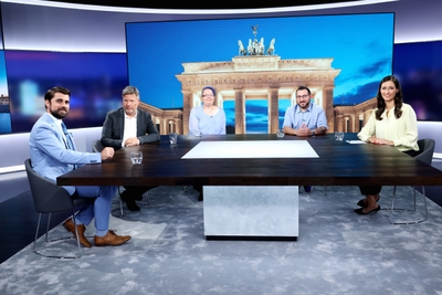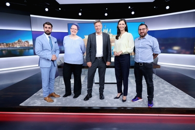 (v.l.) Max Jankowsky (30), Geschäftsführer, ledig, ein Kind aus Lößnitz, Bundeswirtschaftsminister Robert Habeck (54), Anna Böck (40), Pfarrerin und Lektorin, ledig aus Moers, Engin Kelik (40), Metallarbeiter, verheiratet, zwei Kinder aus Melle, Moderatorin Pinar Atalay +++ Die Verwendung des sendungsbezogenen Materials ist nur mit dem Hinweis und Verlinkung auf RTL+ gestattet. +++