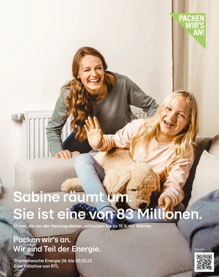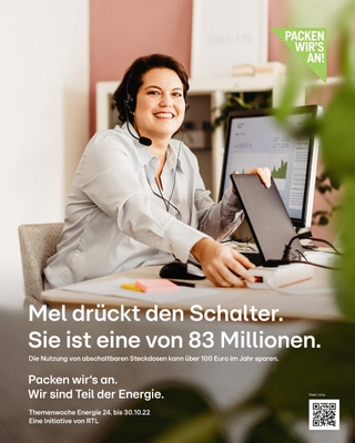 Begleitet wird die Themenwoche ab dem heutigen Montag, 17. Oktober, mit einer umfassenden Marketingkampagne unter dem Motto „Packen wir’s an - Wir sind Teil der Energie!”. Als aufmerksamkeitsstarkes Highlight dient ein Image-Trailer mit GEO-Naturjournalist Dirk Steffens, der das Thema Energie und Nachhaltigkeit übergeordnet betrachtet. Print-Motive, Online-Banner, Werbetrenner, Funkspots und Trailer, die von RTL-Moderator Maik Meuser und RTL/ntv Reporterin Clara Pfeffer moderativ begleitet werden, widmen sich zudem den Themen Heizen, Strom sowie Waschen und geben hilfreiche Tipps und Tricks, wie wir unseren Energieverbrauch reduzieren und dabei auch unsere Kosten im Rahmen halten können. Ein QR-Code verlinkt von den Print- und Online-Anzeigen auf RTL.de/energie – dort gibt es ein großes, redaktionelles Special mit praktischen Infos zum Energiesparen daheim und alternativer Energiegewinnung sowie Quiz- und interaktiven Elementen.