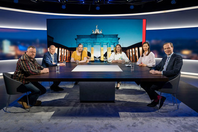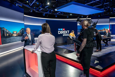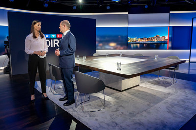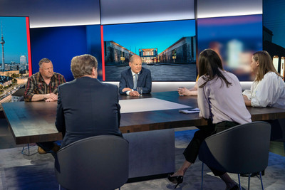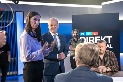 Berlin, 16.05.2022: Moderatorin Pinar Atalay begrüßt Bundeskanzler Olaf Scholz bei 'RTL Direkt Spezial mit Olaf Scholz - Kann der Kanzler Krise?' +++ Die Verwendung des sendungsbezogenen Materials ist nur mit dem Hinweis und Verlinkung auf RTL+ gestattet. +++