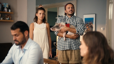 Lena (Lena Meckel, 2.v.l.) und David (David Helmut, 2.v.r.) präsentieren Melisa (Melisa Dobric, r.) und Nico (Nicolas F. Türksever, l.) das neue Haustierferkel. +++ Die Verwendung des sendungsbezogenen Materials ist nur mit dem Hinweis und Verlinkung auf RTL+ gestattet. +++