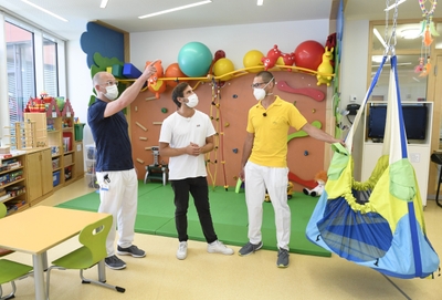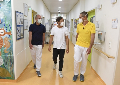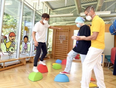 Max Giesinger (l.) besucht als Projektpate fü?r "RTL-Wir helfen Kindern" das Universit?tsklinikum Regensburg. Patientin Rebecca Kronawitter macht Gleichgewichtsü?bungen mit Physiotherapeut Sebastian Meier. Achtung: Bei Veröffentlichung müssen "RTL-Spendenmarathon", bzw. "Stiftung RTL - Wir helfen Kindern" erwähnt werden!! +++ Die Verwendung des sendungsbezogenen Materials ist nur mit dem Hinweis und Verlinkung auf RTL+ gestattet. +++