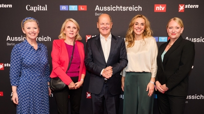 V.l.: Heike Boese, Jutta Bielig-Wonka, Olaf Scholz, Inga Leschek und Nadine to Roxel +++ Die Verwendung des sendungsbezogenen Materials ist nur mit dem Hinweis und Verlinkung auf RTL+ gestattet. +++