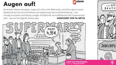 Karikaturist Til Mette: „Für mich war es eine großartige Herausforderung und ich fühlte mich geehrt, als ich für die Kooperation mit der Telekom angefragt wurde. ‚Augen auf!‘ sollte in einem Bild das ausdrücken, was die stern-Leser:innen auch im echten Leben erleben könnten. Dafür habe ich eine klassische Supermarktszene gewählt, die Hass und Vorurteile sichtbar macht und sie mit einer humorvollen Pointe auflöst. Das Jodeldiplom als Referenz zu Loriot ist für mich die perfekte Wendung und erreicht die stern Leser:innen hoffentlich mit Humor - und damit zum Nachdenken über die Botschaft „Augen auf!“.“