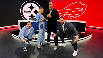 Die Moderatoren im Studio V.l.: Mitja Lafere, Jana Wosnitza, Patrick Esume und Björn Werner beim ersten Wildcard Spiel der Pittsburgh Steelers gegen die Buffalo Bills. +++ Die Verwendung des sendungsbezogenen Materials ist nur mit dem Hinweis und Verlinkung auf RTL+ gestattet. +++