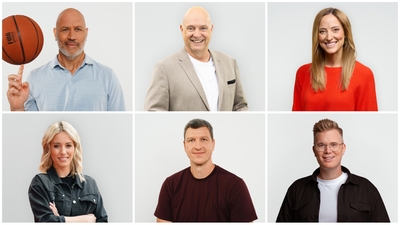 Das RTL - On - Air - Team zur Basketball-EM 2025: V.l.o.: Denis Wucherer, Frank Buschmann und Anna Fleischhauer V.l.u.: Laura Papendick, Patrick Femerling und Tobias Budde +++ Die Verwendung des sendungsbezogenen Materials ist nur mit dem Hinweis und Verlinkung auf RTL+ gestattet. +++