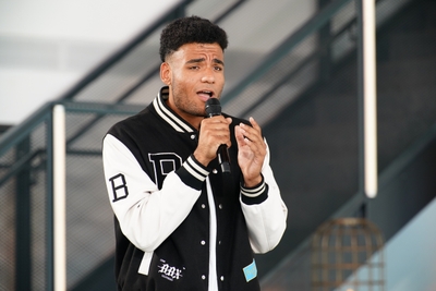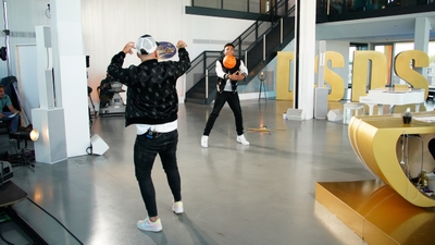 Kyle Jerz (r.) aus Krefeld spielt mit Jurymitglied Pietro Lombardi Basketball. +++ Die Verwendung des sendungsbezogenen Materials ist nur mit dem Hinweis und Verlinkung auf RTL+ gestattet. +++