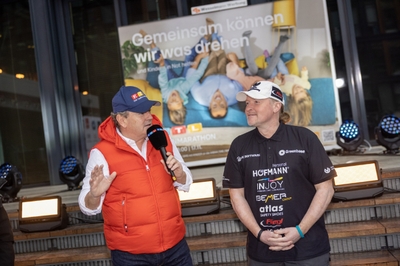 Wolfam Kons (li.) und Joey Kelly bei der Vorstellung der 24h-Climbing-Challenge in der Sendezentrale von RTL Deutschland in Köln-Deutz. +++ Die Verwendung des sendungsbezogenen Materials ist nur mit dem Hinweis und Verlinkung auf RTL+ gestattet. +++